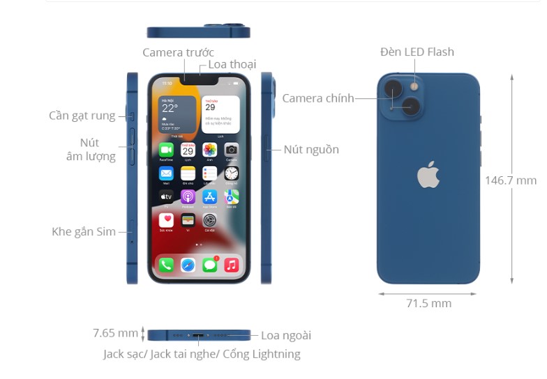 iPhone 13 có thiết kế nguyên khối vuông vắn như tiền nhiệm, khung viền được làm từ nhôm cùng mặt lưng kính sang trọng, cao cấp.